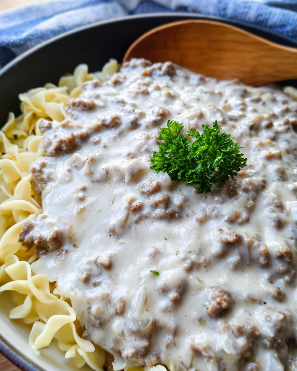 Grandma’s Country Beef Gravy is the ultimate comfort food that delivers warmth and satisfaction in every bite. This dish features tender ground beef sautéed with onions, all smothered in a rich and creamy white gravy, creating a delightful harmony of flavors. Served over buttered noodles, it’s perfect for family dinners or brunch gatherings. This quick and easy recipe transforms simple ingredients into a hearty meal that will have everyone asking for seconds.