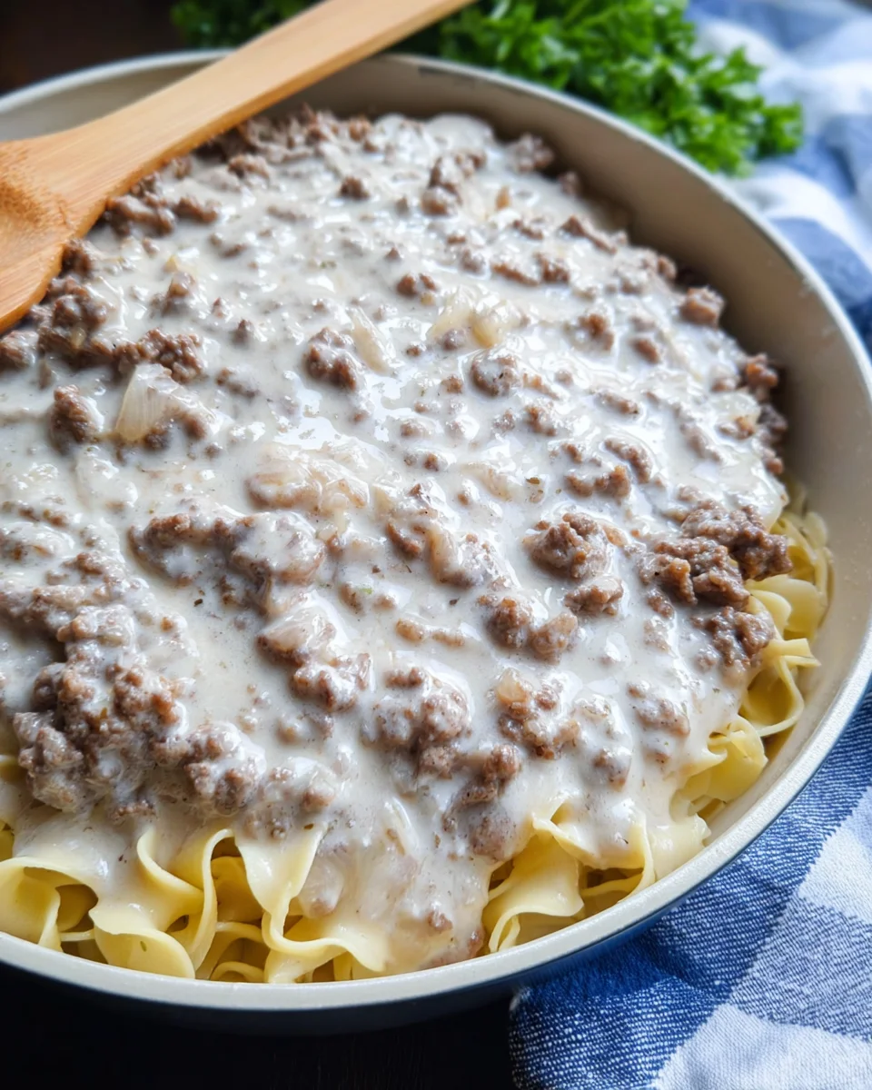 Grandma’s Country Beef Gravy is the ultimate comfort food that warms your heart and fills your belly. This dish features savory ground beef mixed with sautéed onions, all enveloped in a rich, creamy white gravy. Served over buttered noodles, it’s perfect for family dinners, brunch gatherings, or any occasion that calls for hearty satisfaction. The unique blend of flavors will have everyone coming back for seconds!