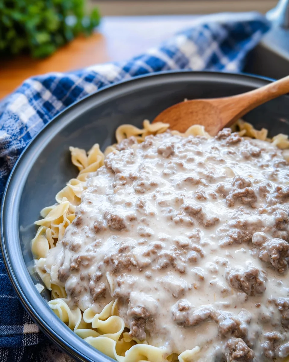 This gravy pairs wonderfully with egg noodles but also works well over mashed potatoes or rice for a hearty meal.
