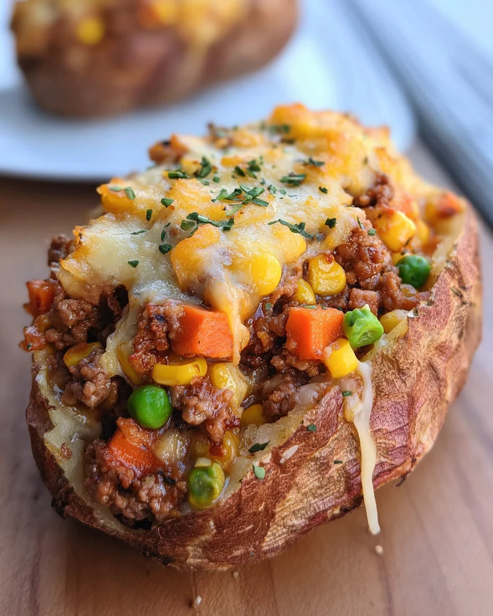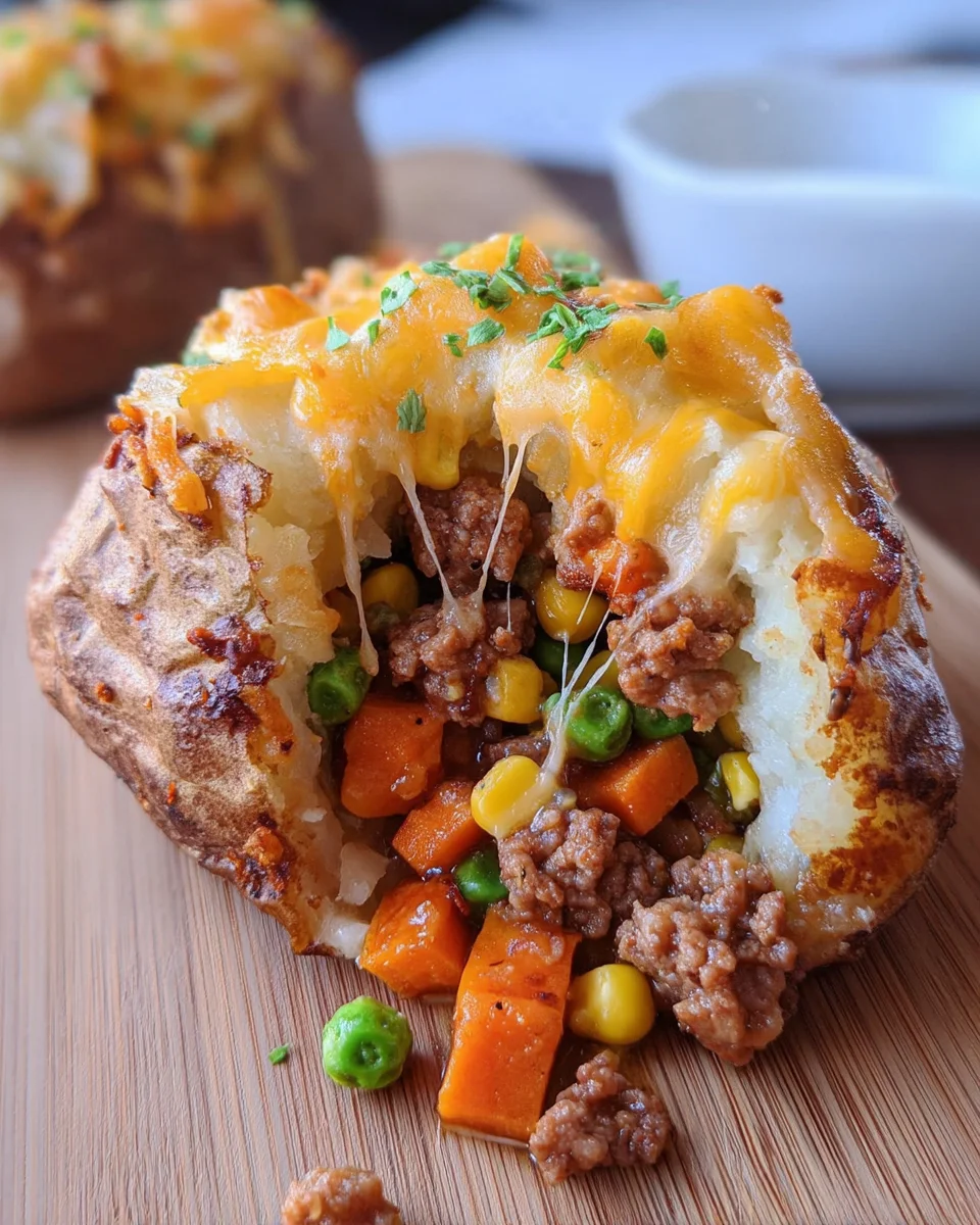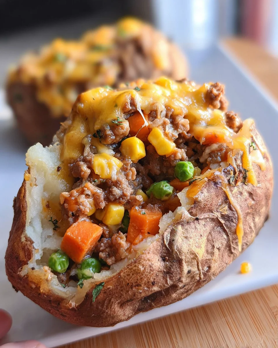 Shepherd’s Pie Baked Potatoes is a comforting dish featuring fluffy baked potatoes topped with a savory meat and vegetable mixture.